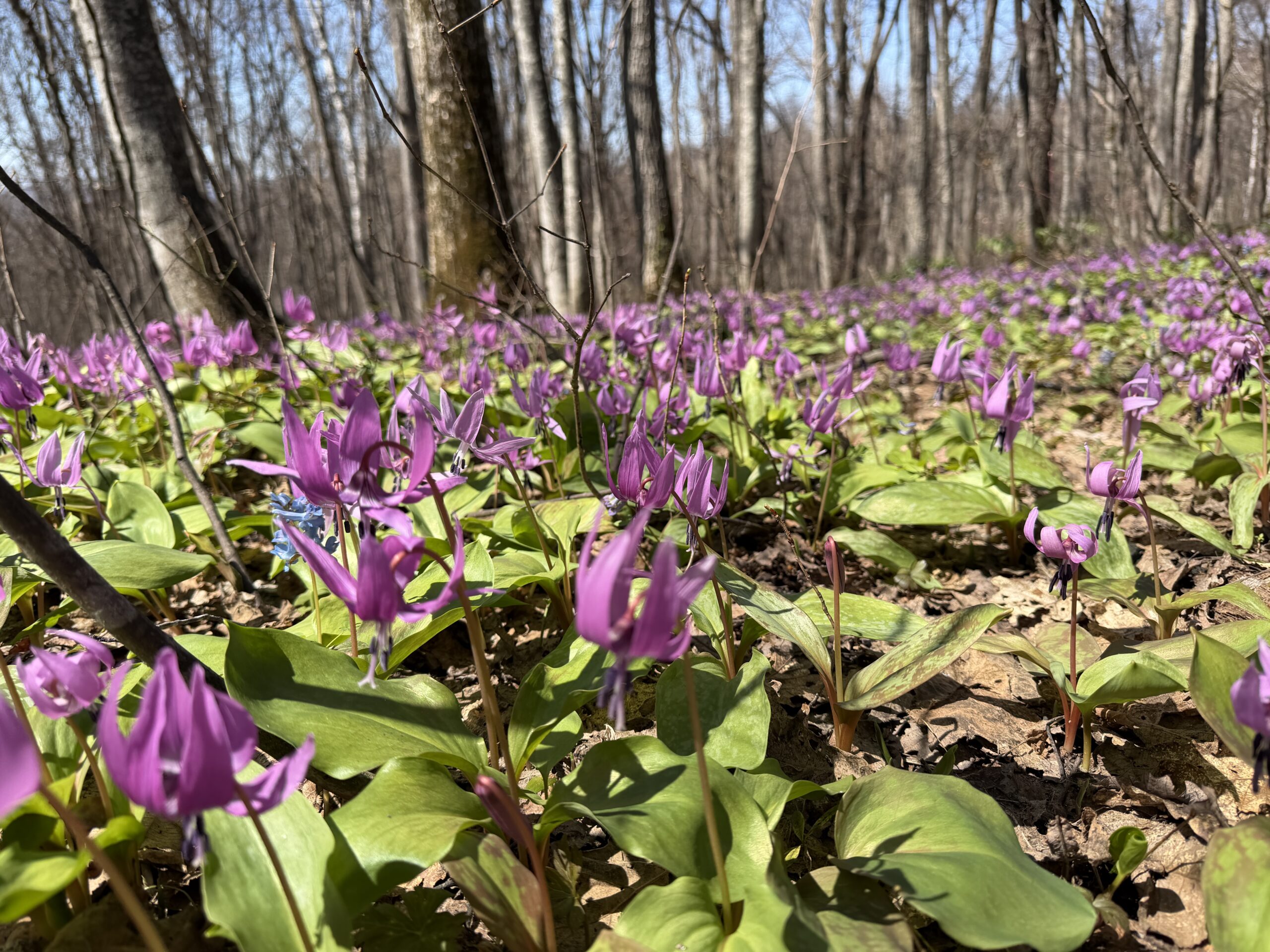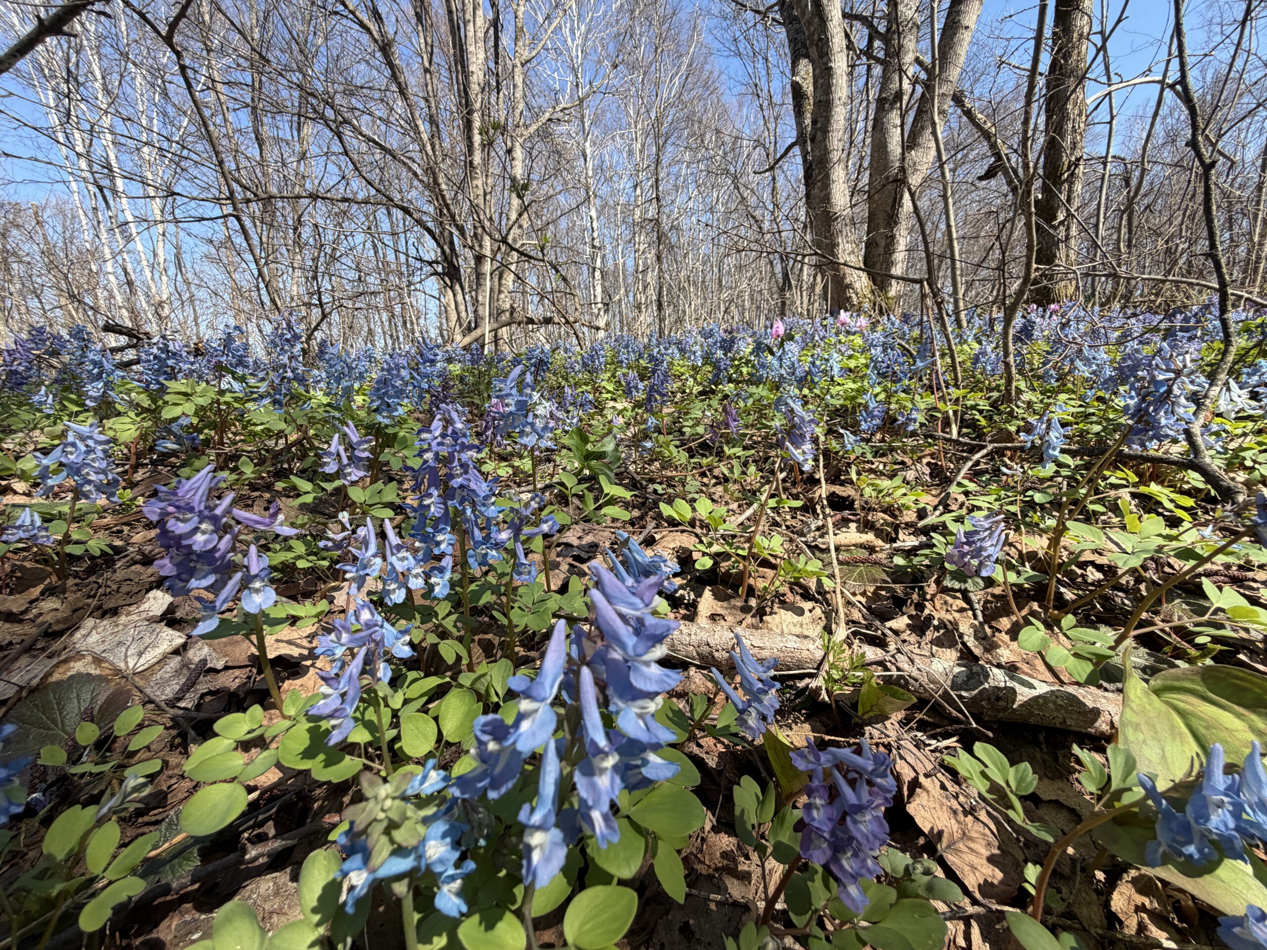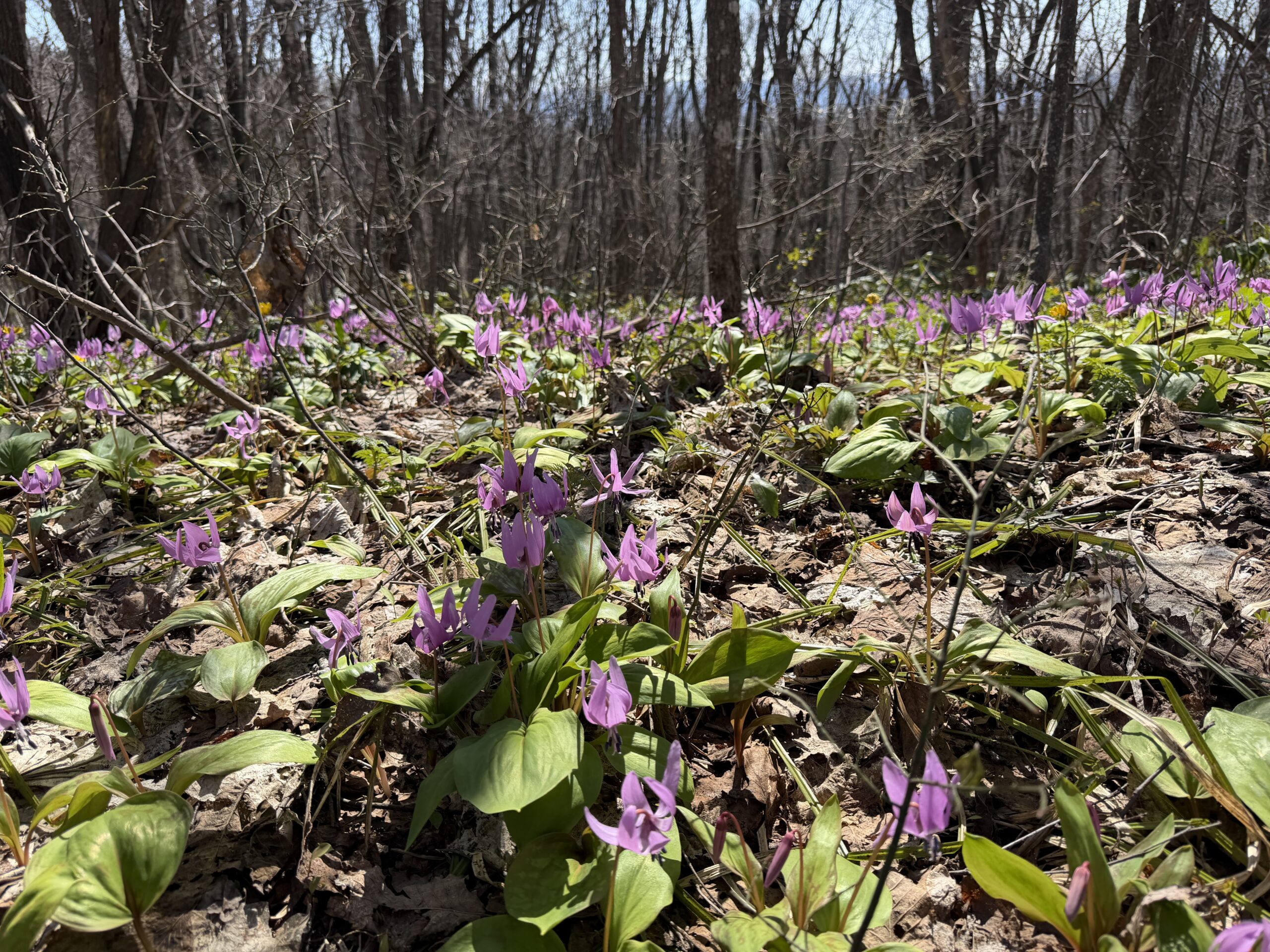 突哨山ではカタクリ、フクジュソウ、エゾエンゴサク、キクザキイチゲ、アズマイチゲが咲きだしました。中でもカタクリは国内有数の群落を形成しています。