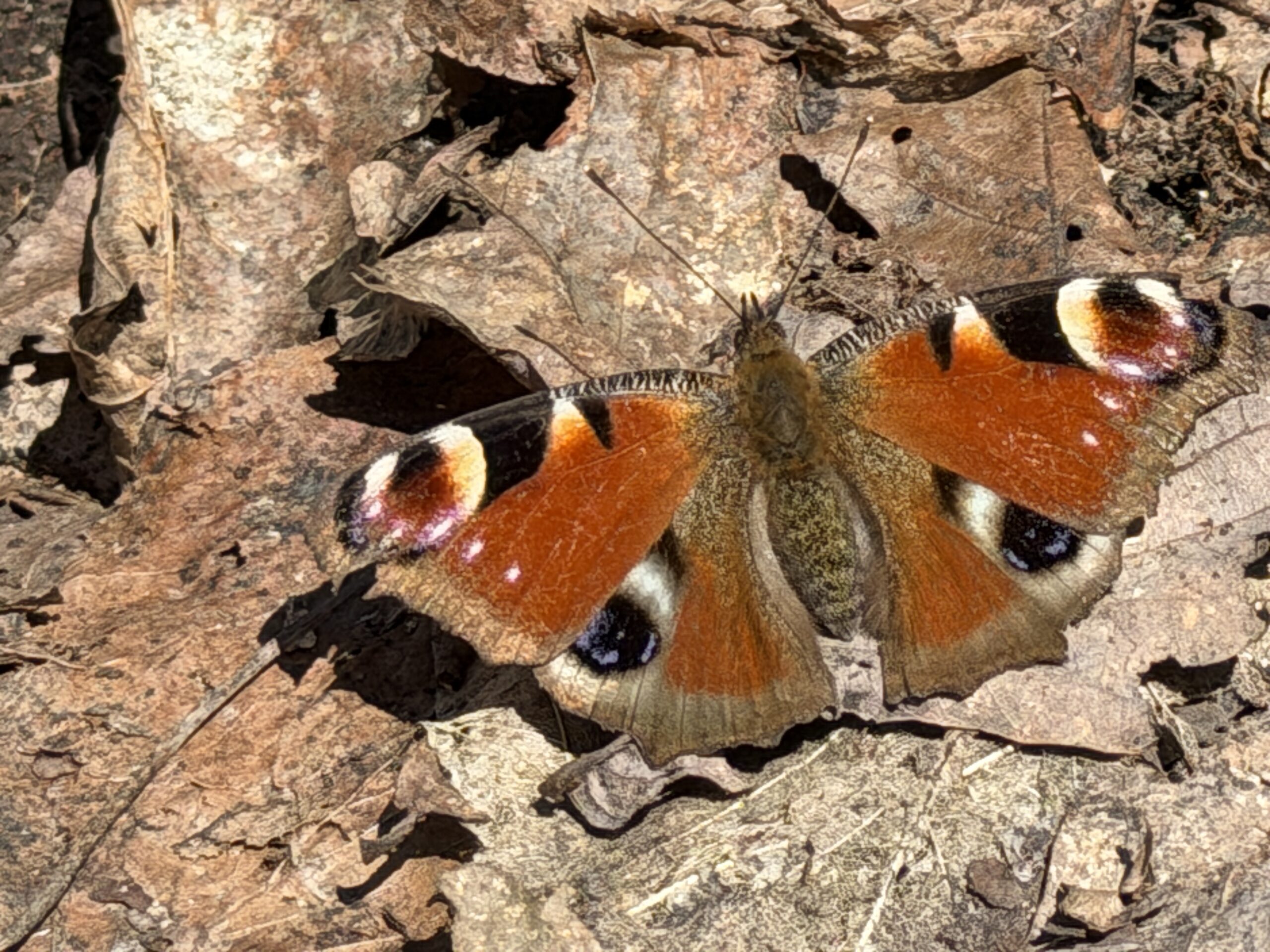 クジャクチョウ 大きな目玉模様で鳥類などの天敵から身を守ると言われる。翅の裏側は褐色で枯れ葉や樹皮に止まって翅を閉じると見分けがつきにくい。