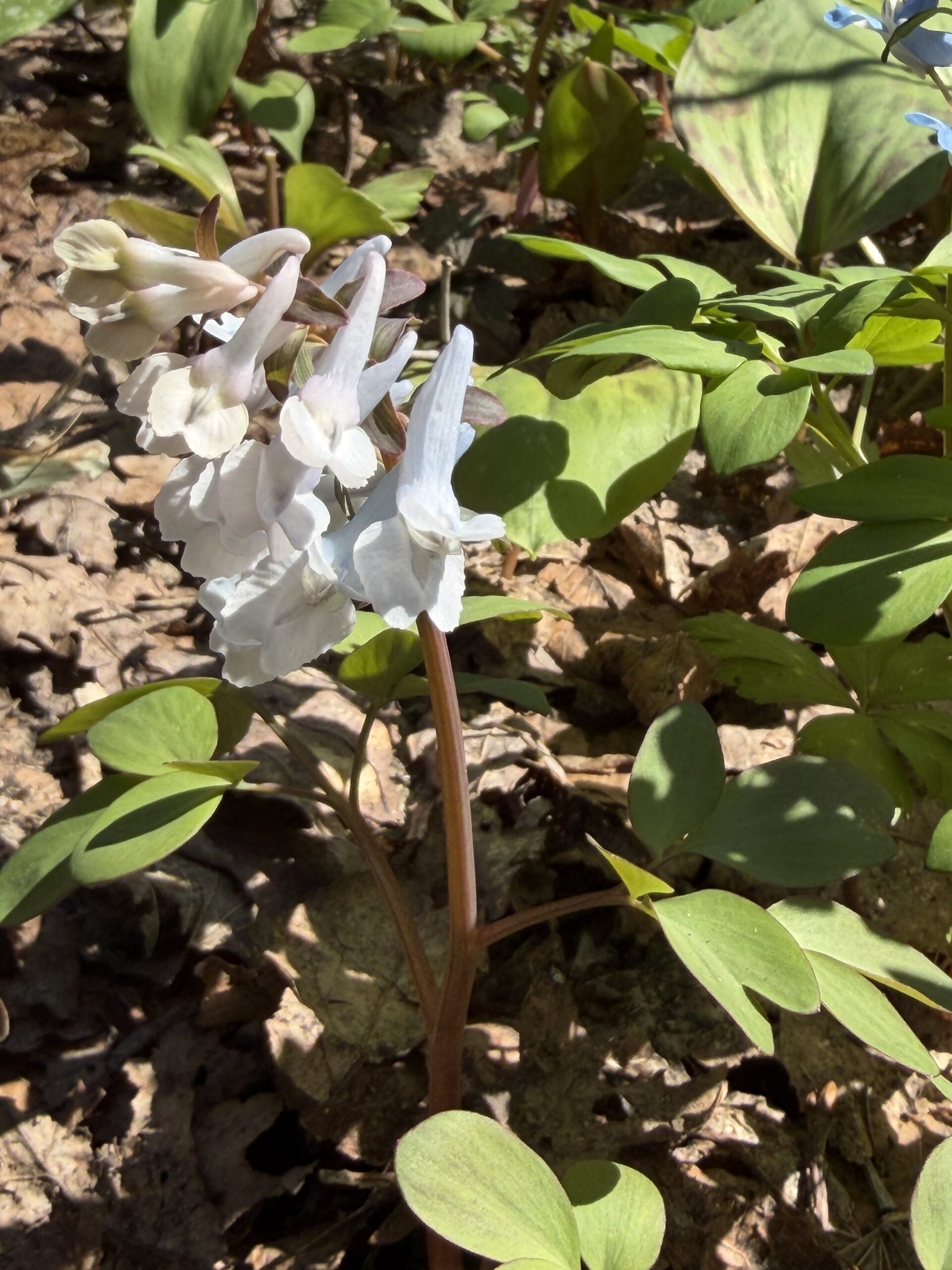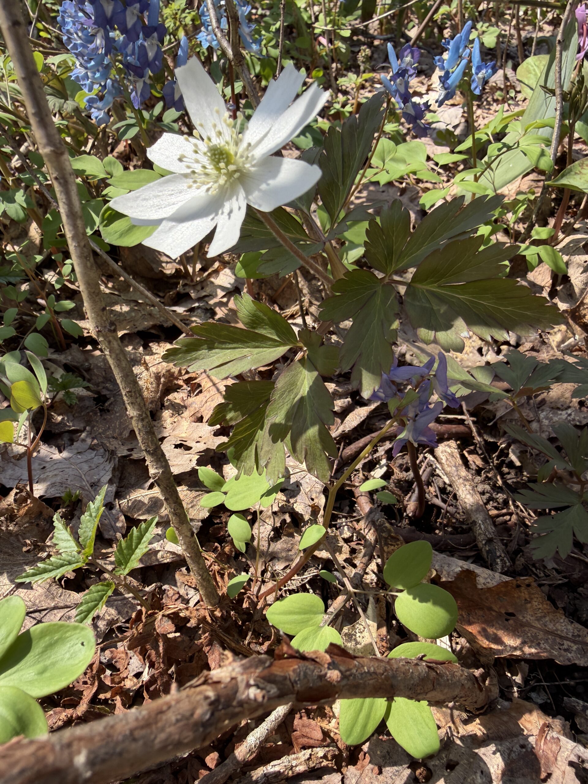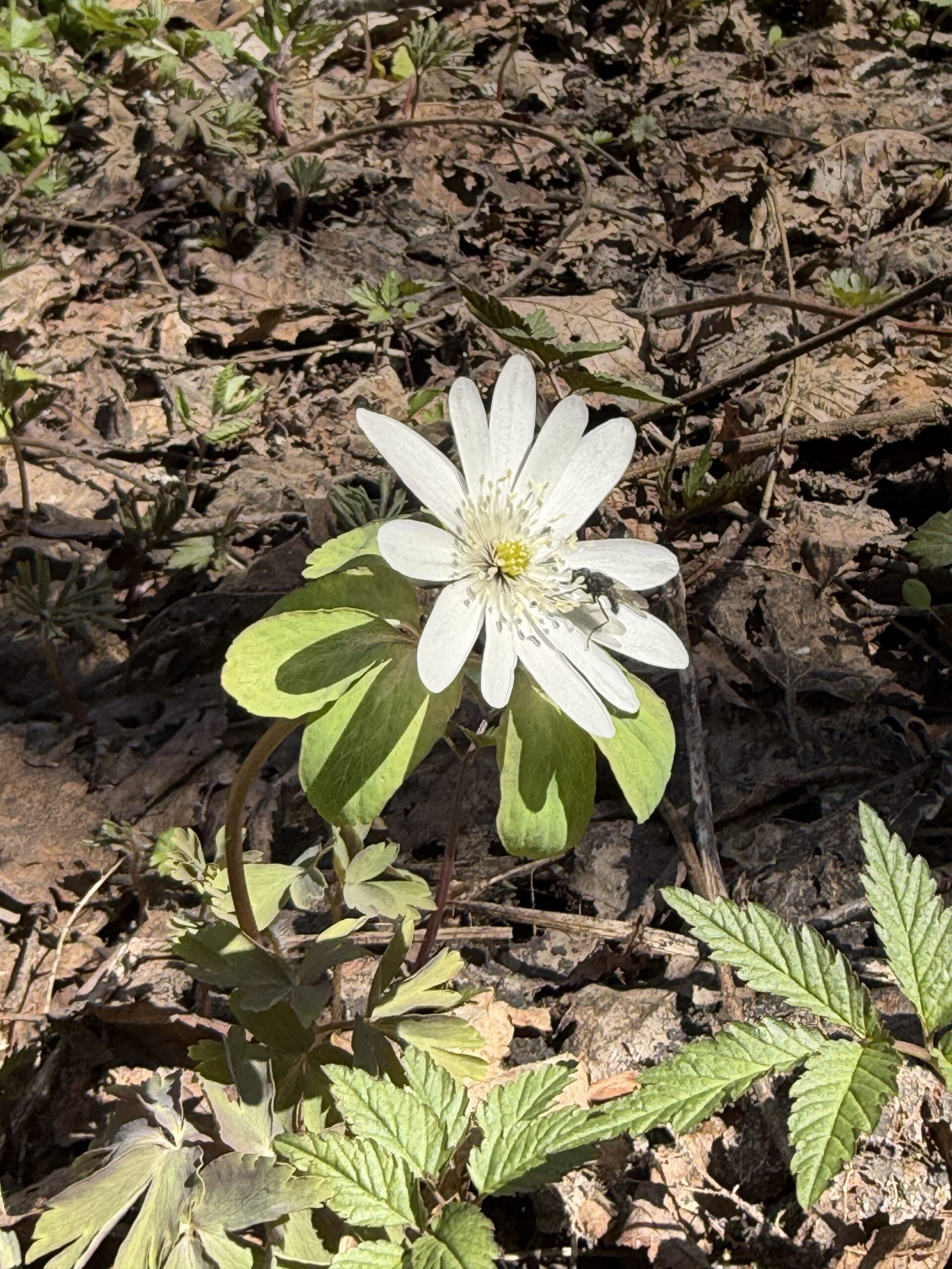 アズマイチゲ、長い茎に一輪の花(がく片)と小葉が見られる。