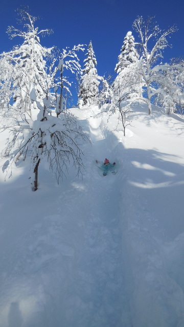 さすが若いお父さん、腰までくるラッセルを難なくこなしてくれてありがとうございました。午後の部はかわいい娘さんの一番楽しみにしていた尻滑り会場へ。